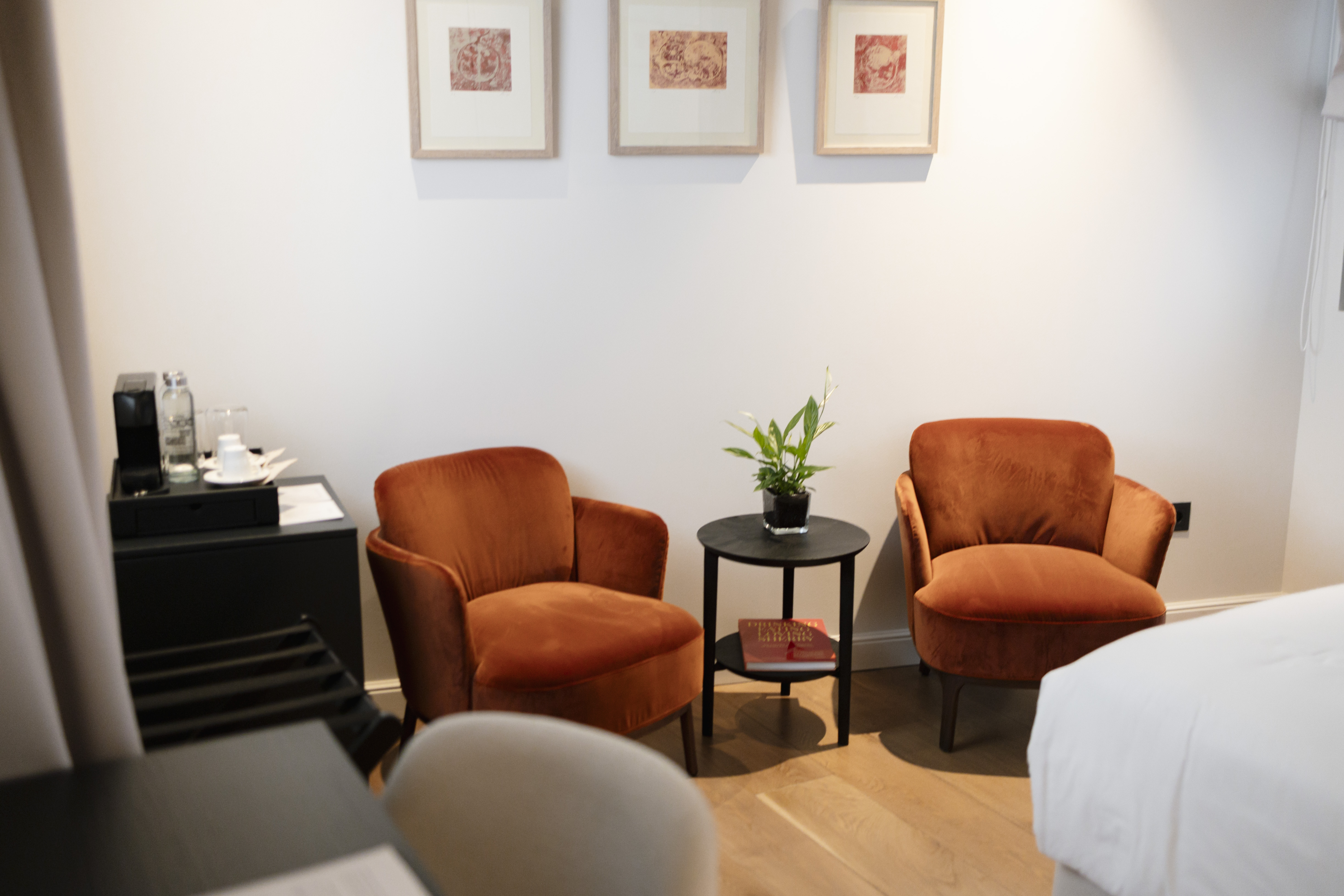 Bedroom features: Black furniture. 2 orange armchairs and a beige chair for black desk. Windows in the headboard overlooking inner courtyard and cathedral tower and window to inner courtyard hotel 3 door closet with minibar outside black wood color. Striped beige headboard.
