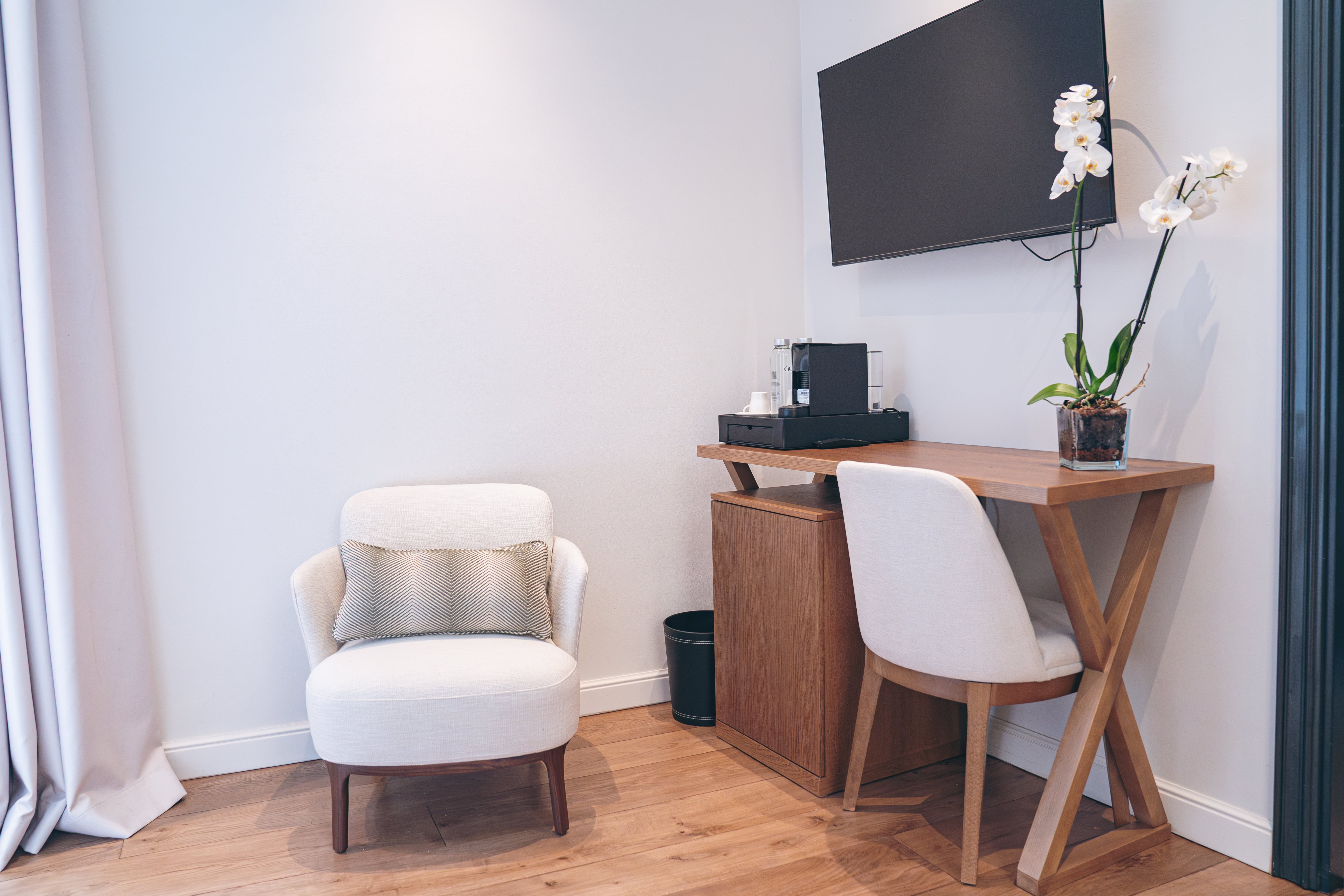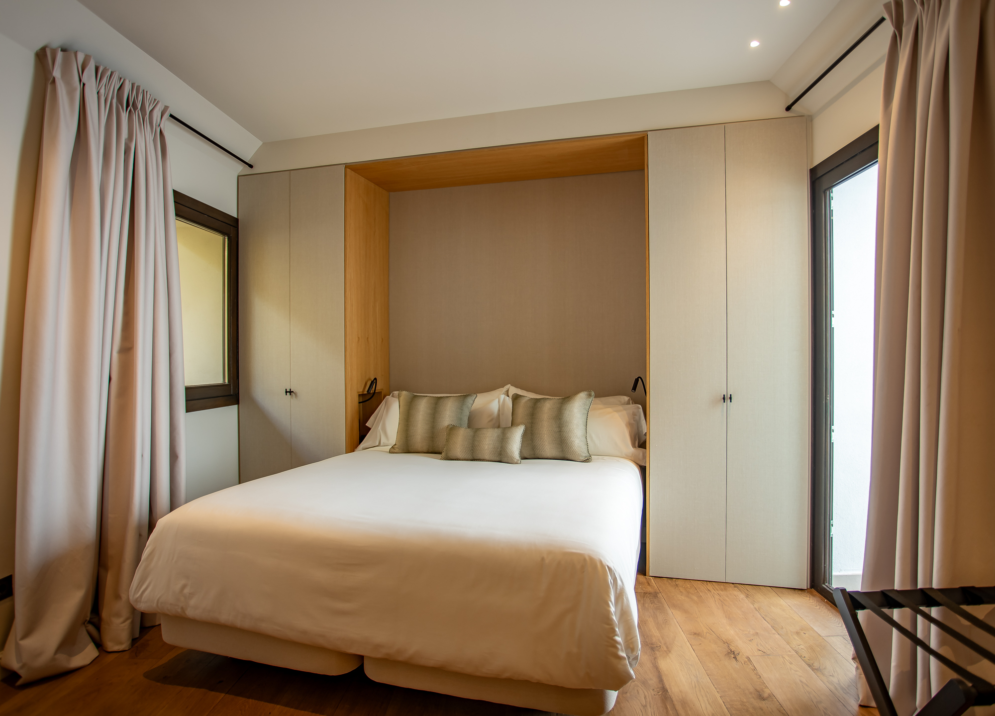 Características del Dormitorio: nada más entrar, encontramos a la izquierda la cama, cobijada en una estructura de madera con sendos armarios a ambos lados de la cama, revestidos con tela de lino gris. A la derecha, la mesa de escritorio color leña, acompañada de una silla de escritorio y dos sillones bajos color beige. Cruzando la estancia, en la terraza privada, dos sillas de mimbre adornadas con cojines a rayas grises y blancas, para disfrutar del sol y de la tranquilidad del patio.