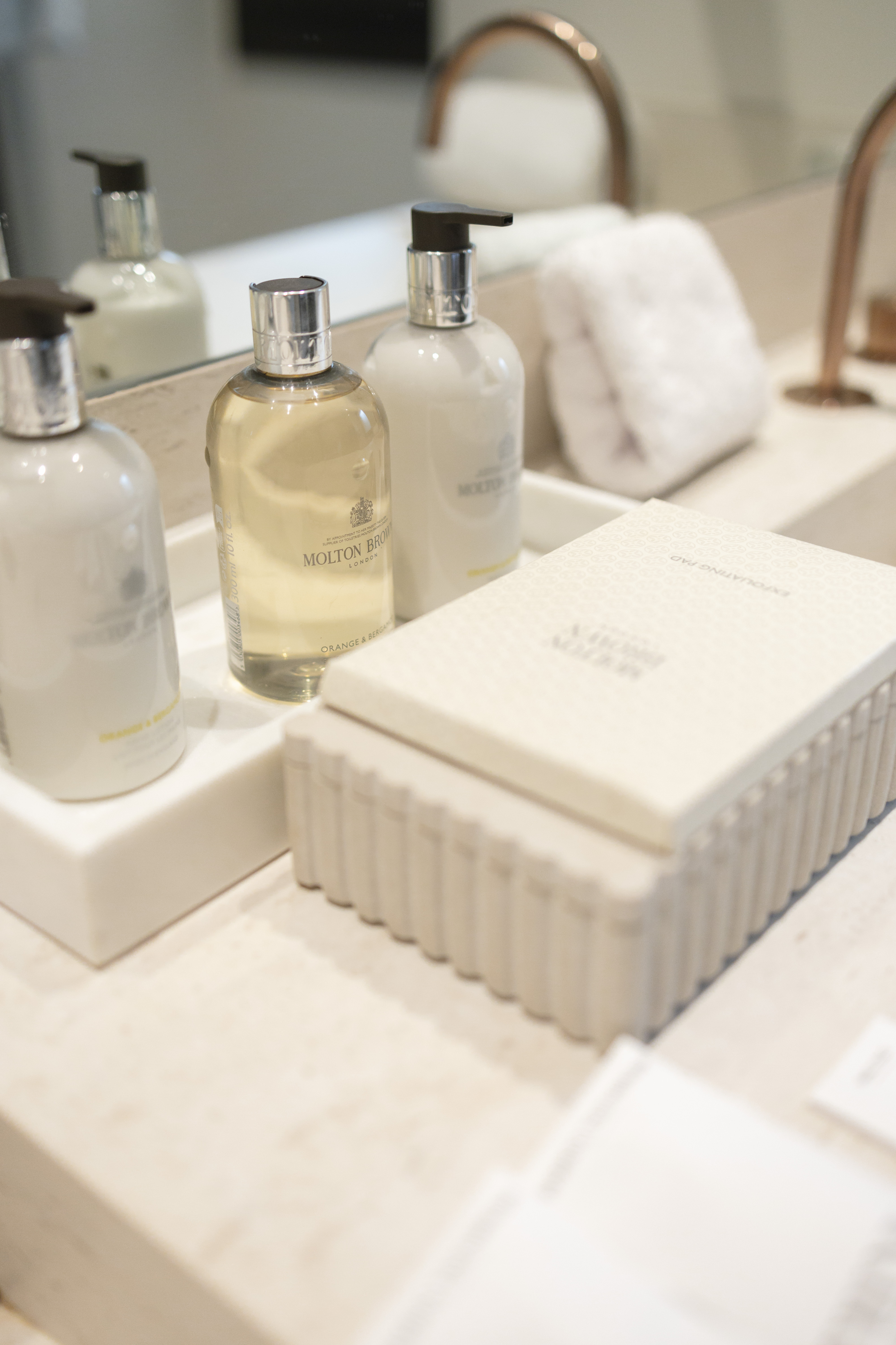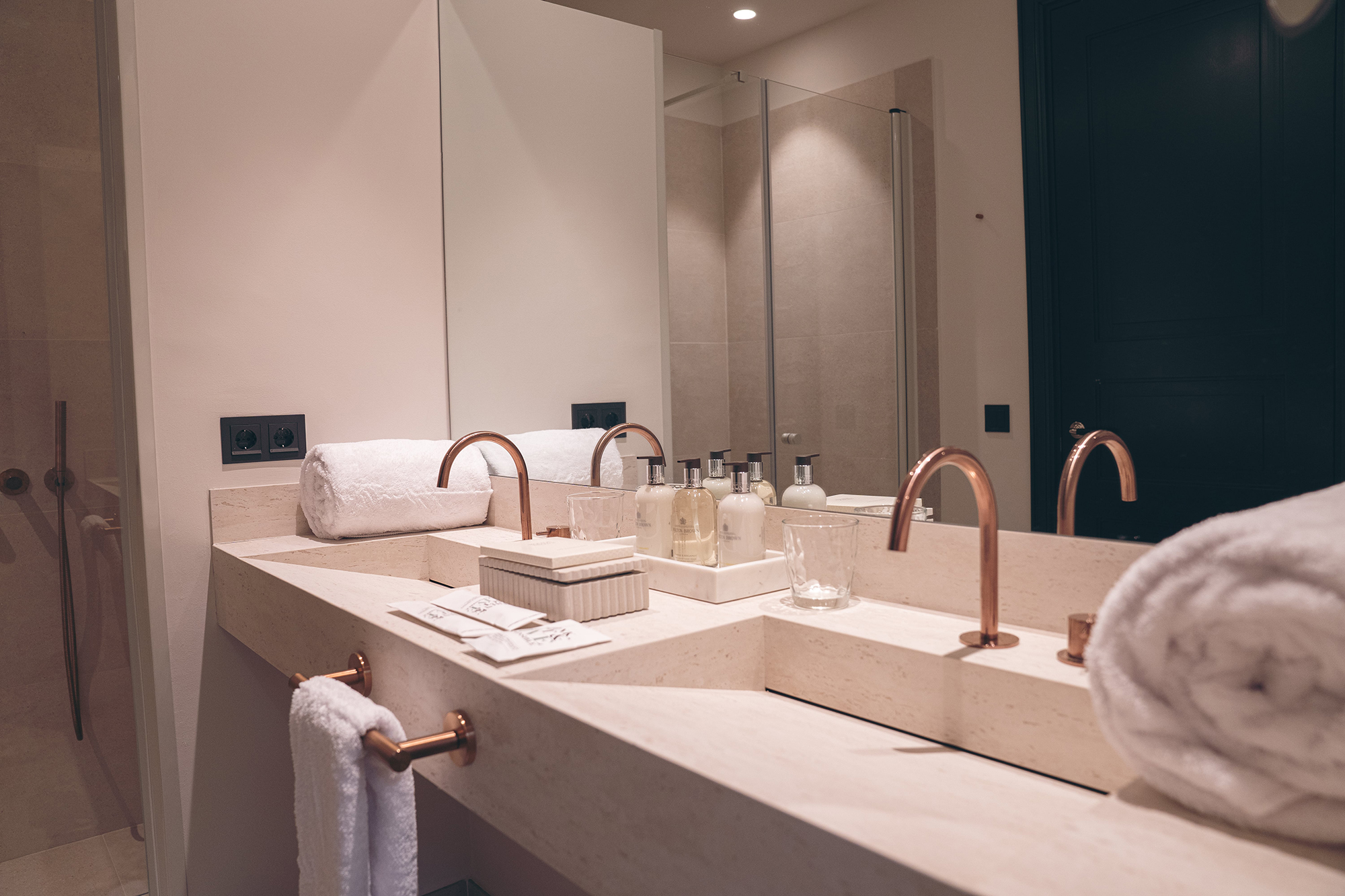 Características baño: al acceder a él, encontramos una pared frontal cubierta de un espejo a media altura, con senos de mármol beige y apliques color cobre, al igual que en la ducha, a su izquierda. La ducha está compuesta por cabezal de cortina de ducha efecto lluvia y chorros de hidromasaje. El wc se encuentra a la derecha, manteniendo cierta independencia del resto del baño para mayor privacidad.