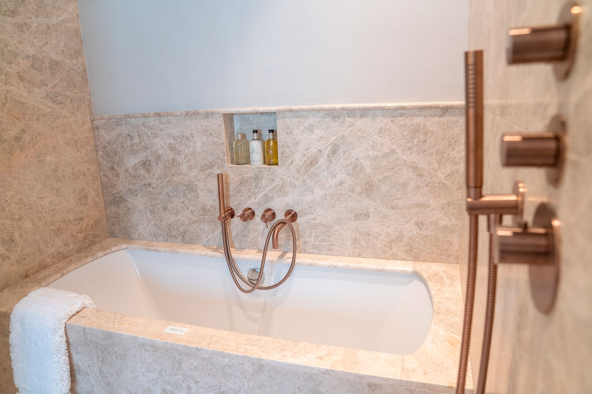 Características baño: Cuenta con bañera y placa de ducha. Apliques color cobre. Ventana a patio interior.