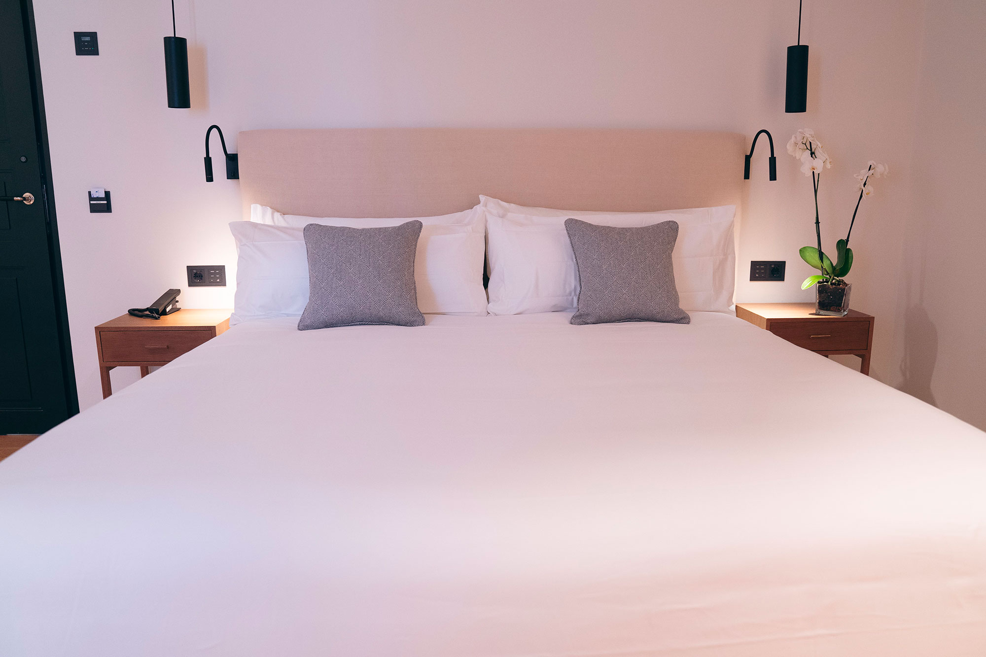 Características dormitorio: Vista lateral a cuesta encarnación. Mobiliario color marrón leña. Armario 3 puertas con el minibar dentro. Mobiliario: Sofá beige + escritorio + 1 silla escritorio beige. Cabecero color Beige