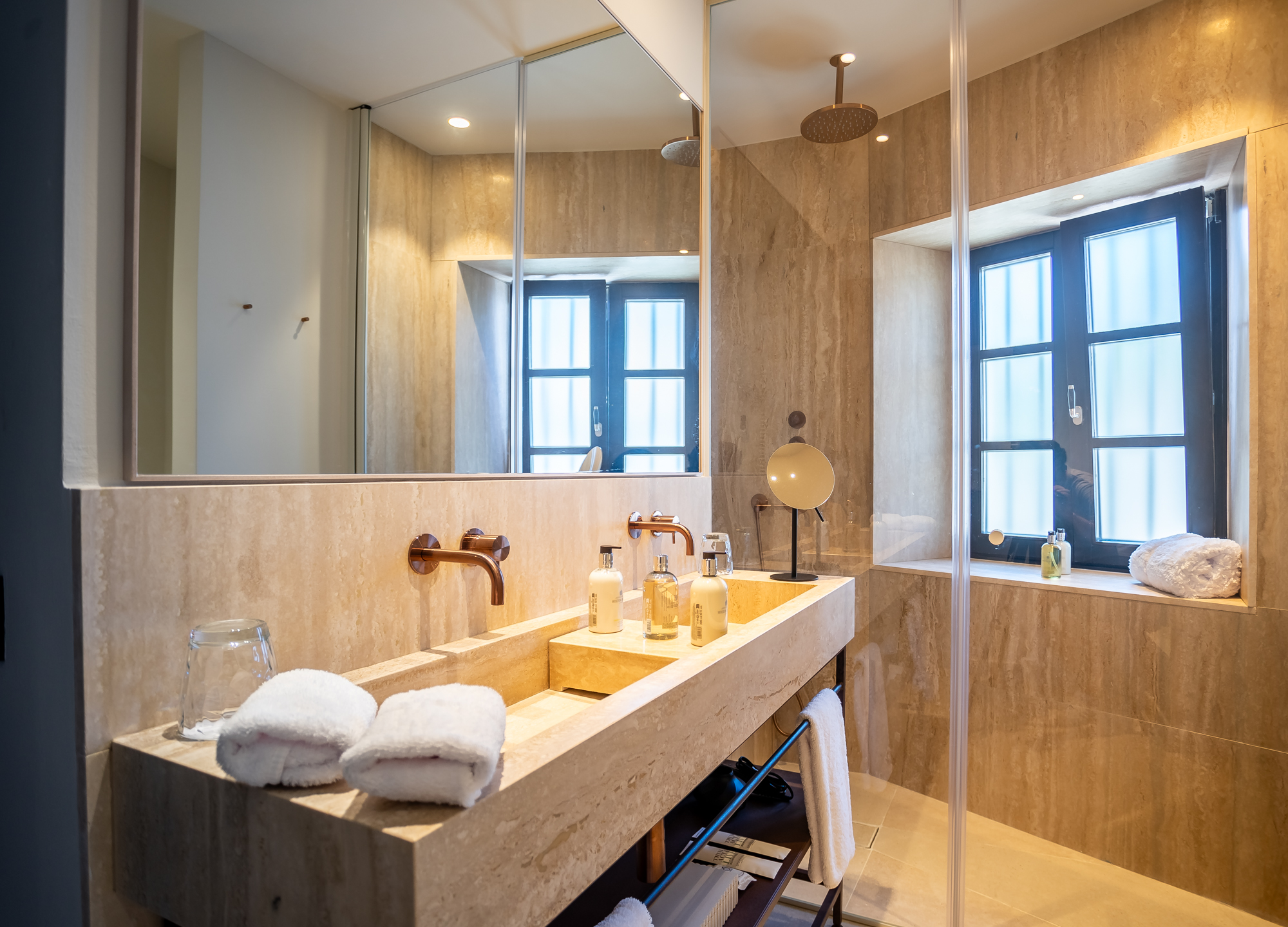 Características baño: el acceso acodado nos desemboca en un amplio baño con senos dobles de mármol color beige a la izquierda, con apliques color cobre. La ducha se encuentra al fondo, con ventana propia, cabezal con efecto lluvia y chorros de hidromasaje, así como un banco interior de mármol.