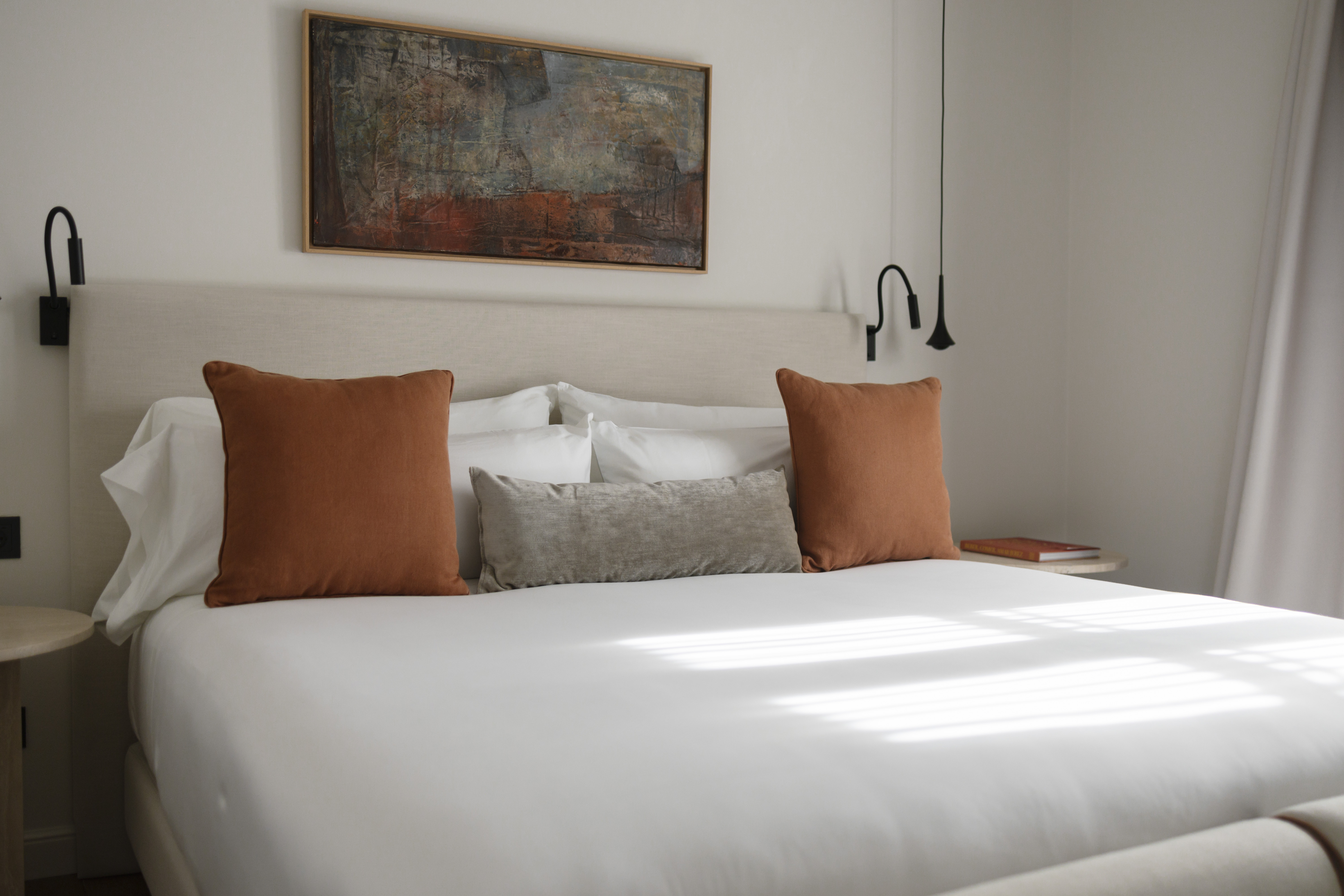 Características dormitorio: ventanas orientadas al sur / sureste, con vistas a una calleja conocida como Cuesta de la Encarnación, desde la que se accede al lateral de la Catedral y al Alcázar. Al entrar a la habitación, de techo abuhardillado, encontramos la cama a la izquierda, flanqueada por dos luces de noche suspendidas en el techo sobre las mesillas de noche, y acompañada a los pies por un escabel beige. A la derecha, armario de madera revestido de tela de lino gris, de tres puertas, y escritorio color leña.